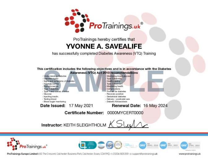 This course is aimed at anyone who requires a course in diabetes awareness in any workplace or family setting. Diabetes is included in many of our online and classroom courses but this course goes into more depth for people working with or looking after diabetes sufferers. We also offer a 100% classroom course nationwide for this and the certificate is valid for three years to comply with recommendations. To renew your qualification, simply complete the same course again.