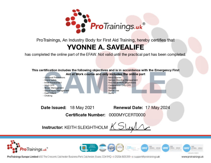 To renew, you must attend another EFAW 6-hour course or blended course, or participate in an annual first aid refresher course in the classroom. The HSE strongly recommends that all first aiders undergo an annual first aid refresher course, and our online course satisfies this requirement. Note that learners undertaking a ProTrainings Training Course can opt for a regulated qualification.