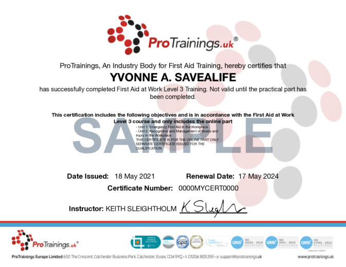 The ProTrainings First Aid at Work Level 3 (VTQ) qualification (FAW) is ideal for most businesses whose risk assessment has identified that they require a fully trained first aider for their workplace. All courses are delivered, evaluated and quality assured to meet the new guidelines set out by the HSE in October 2017 and meet the requirements of the First Aid at Work (First Aid) regulations 1981 and subsequent changes.