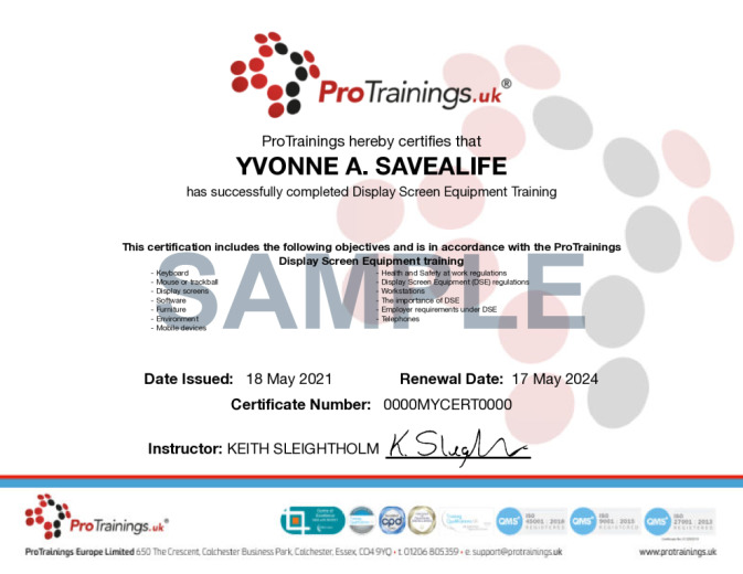 Further training on reducing injury can be gained by completing our Manual Handling course and more information on this DSE requirements can be found on our website. ProTrainings Europe are proud sponsors of Backcare who aim to significantly reduce the burden of back pain by providing information and advice to all people and organisations affected by back pain.